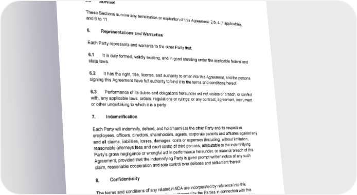 Either Party may terminate this Agreement at any time after the filing of any petition in bankruptcy or for reorganization or debt consolidation under the federal bankruptcy laws, or upontheother Party’s making of an assignment of any of its assets for the benefit of creditors, or upon the application by the other Party for the appointment of a receiver or trustee of its assets. 5.5 Survival TheseSections survive any termination or expiration of this Agreement: 2.6, 4 (if applicable), and6to11. 6. Representations and Warranties EachParty represents and warrants to the other Party that: 6.1 It is duly formed, validly existing, and in good standing under the applicable federal and state laws. 6.2 It has the right, title, license, and authority to enter into this Agreement, and the persons signing this Agreement have full authority to bind it to the terms and conditions hereof. 6.3 Performance of its duties and obligations hereunder will not violate or breach, or conflict with, any applicable laws, orders, regulations or rulings; or any contract, agreement, instrument or other undertaking to which it is a party. 7. Indemnification EachParty will indemnify, defend, and hold harmless the other Party and its respective employees, officers, directors, shareholders, agents, corporate parents and affiliates against any andall claims, liabilities, losses, damages, costs or expenses (including, without limitation, reasonable attorneys fees and court costs) of third persons, attributable to the indemnifying Party’s gross negligence or wrongful act in performance hereunder, or material breach of this Agreement; provided that the indemnifying Party is given prompt written notice of any such claim, reasonable cooperation and sole control over defense and settlement thereof. 8. Confidentiality Thetermsandconditions of any related mNDA are incorporated by reference into this Agreement and apply to any information exchanged by the Parties in connection with this Agreement. This Agreement will control if its terms conflict with the mNDA. The terms of this Agreement are Confidential Information (as defined in the mNDA) of both Parties. Notwithstanding anything to the contrary in the mNDA, the term of the mNDA shall continue for the longer of (i) the term specified in the mNDA or (ii) the duration of the Term in this Agreement.