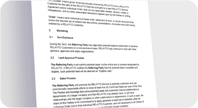 “Confirmed Sale” means a consummated sale of RELAYTO Service to an Eligible Lead per Section 2.4. “Eligible Lead” means a potential RELAYTO Customer that the Referring Party refers to RELAYTO,pertheprocessinSection2.2. “Net Income” means gross revenues actually received by RELAYTO from a RELAYTO Customer for the sale of the RELAYTO Service pursuant to a valid RELAYTO Service Agreement and/or individual Order, less (a) any applicable rebates, refunds, credits of chargebacks, and (ii) other reasonable deductions agreed upon by the Parties in writing. “Order” means each individual purchase order, statement of work, or similar document that covers the discrete set of related web documents, presentations, microsites and users being ordered by a RELAYTO Customer. 2. Marketing 2.1 Non-Exclusive During the Term, the Referring Party may approach potential leads to solicit them to become RELAYTOCustomersonanon-exclusivebasis.RELAYTOmaycontinuetoworkwithother partners, agencies and sales organizations. 2.2 LeadApprovalProcess TheReferring Party must submit potential leads via the online tool or process designated by RELAYTO.IfRELAYTOnotifiestheReferring Party that the potential lead is available and eligible, such potential lead will be deemed an “Eligible Lead.” 2.3 Sales Process TheReferring Party will promote the RELAYTO Service to potential customers and use commercially reasonable efforts to close at least five (5) Confirmed Sales per year of the Term. TheParties acknowledge that some potential leads and customers may be subdivisions or departments of a larger company and that RELAYTO may already have, or will have, relationships with the larger company or other subdivisions or departments. In such a case, the intent of the Parties is for Commissions to apply generally to each set of websites under an individual Order and to that individual RELAYTO Customer, and not necessarily to all Orders of the larger company or other subdivisions and departments of such company. Referring Party may retain partners to promote and assist it in soliciting customers under this Agreement, subject to RELAYTO’s approval (each a “Partner”) provided the Referring Party is liable for all acts and omissions of such Partner.
