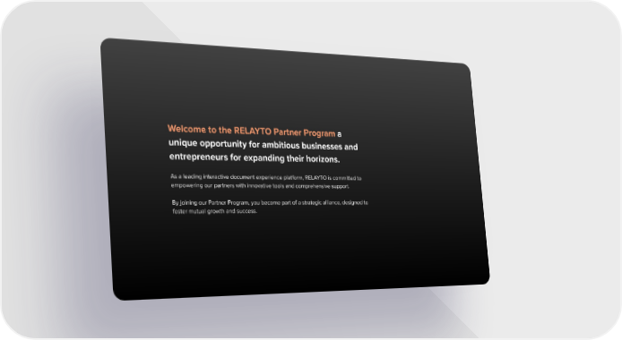 Welcome to the RELAYTO Partner Program a unique opportunity for ambitious businesses and entrepreneurs for expanding their horizons. As a leading interactive document experience platform, RELAYTO is committed to empowering our partners with innovative tools and comprehensive support. By joining our Partner Program, you become part of a strategic alliance, designed to foster mutual growth and success.