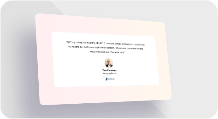 “We're growing our recurring RELAYTO revenues to tens of thousands per year just by helping our customers digitize their content. We win, our customers win and RELAYTO wins, too. Everyone wins.” Tom Clements Managing Partner