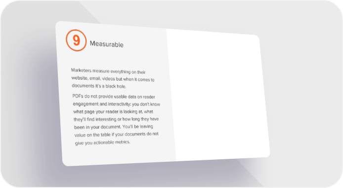 Measurable Marketers measure everything on their website, email, videos but when it comes to documents it’s a black hole. PDFs do not provide usable data on reader engagement and interactivity: you don’t know what page your reader is looking at, what they’ll find interesting or how long they have been in your document. You’ll be leaving value on the table if your documents do not give you actionable metrics.