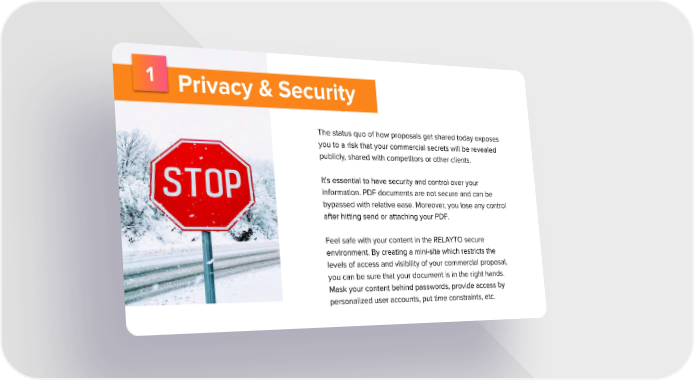 1 Privacy & Security The status quo of how proposals get shared today exposes you to a risk that your commercial secrets will be revealed publicly, shared with competitors or other clients. It's essential to have security and control over your information. PDF documents are not secure and can be bypassed with relative ease. Moreover, you lose any control after hitting send or attaching your PDF. Feel safe with your content in the RELAYTO secure environment. By creating a mini-site which restricts the levels of access and visibility of your commercial proposal, you can be sure that your document is in the right hands. Mask your content behind passwords, provide access by personalized user accounts, put time constraints, etc.