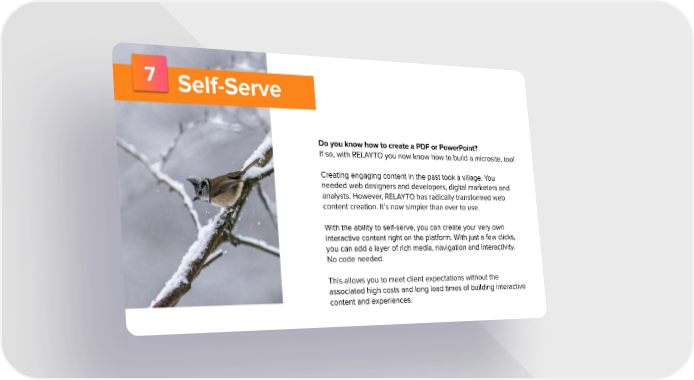 7 Self-Serve Do you know how to create a PDF or PowerPoint? If so, with RELAYTO you now know how to build a microsite, too! Creating engaging content in the past took a village. You needed web designers and developers, digital marketers and analysts. However, RELAYTO has radically transformed web content creation. It’s now simpler than ever to use. With the ability to self-serve, you can create your very own interactive content right on the platform. With just a few clicks, you can add a layer of rich media, navigation and interactivity. No code needed. This allows you to meet client expectations without the associated high costs and long lead times of building interactive content and experiences.