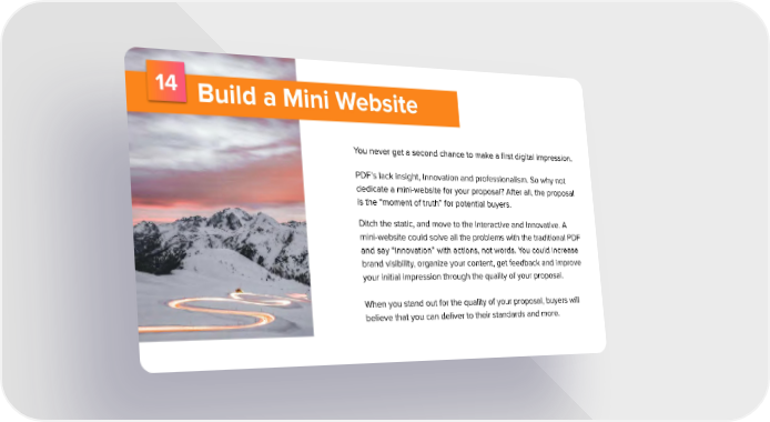 14 Build a Mini Website You never get a second chance to make a first digital impression. PDF’s lack insight, innovation and professionalism. So why not dedicate a mini-website for your proposal? After all, the proposal is the “moment of truth” for potential buyers. Ditch the static, and move to the interactive and innovative. A mini-website could solve all the problems with the traditional PDF and say “innovation” with actions, not words. You could increase brand visibility, organize your content, get feedback and improve your initial impression through the quality of your proposal. When you stand out for the quality of your proposal, buyers will believe that you can deliver to their standards and more.