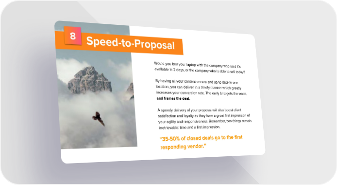 8 Speed-to-Proposal Would you buy your laptop with the company who said it’s available in 2 days, or the company who is able to sell today? By having all your content secure and up to date in one location, you can deliver in a timely manner which greatly increases your conversion rate. The early bird gets the worm, and frames the deal. A speedy delivery of your proposal will also boost client satisfaction and loyalty as they form a great first impression of your agility and responsiveness. Remember, two things remain irretrievable: time and a first impression. “35-50% of closed deals go to the first responding vendor.”