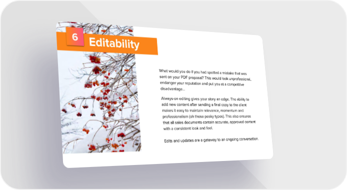 6 Editability What would you do if you had spotted a mistake that was sent on your PDF proposal? This would look unprofessional, endanger your reputation and put you at a competitive disadvantage... Always-on editing gives your story an edge. The ability to add new content after sending a final copy to the client makes it easy to maintain relevance, momentum and professionalism (oh those pesky typos). This also ensures that all sales documents contain accurate, approved content with a consistent look and feel. Edits and updates are a gateway to an ongoing conversation.