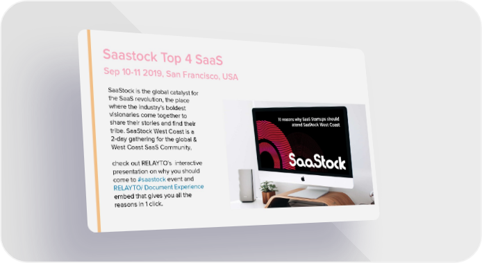 Saastock Top 4 SaaS Sep 10-11 2019, San Francisco, USA SaaStock is the global catalyst for the SaaS revolution, the place where the industry’s boldest visionaries come together to share their stories and find their tribe. SaaStock West Coast is a 2-day gathering for the global & West Coast SaaS Community, check out RELAYTO’s interactive presentation on why you should come to #saastock event and RELAYTO/ Document Experience embed that gives you all the reasons in 1 click.