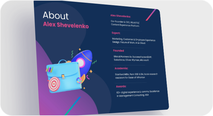 Alex Shevelenko: Co-Founder & CEO, RELAYTO/ About Content Experience Platform Alex Shevelenko Expert: Marketing, Customer & Employee Experience Design, Future of Work, AI & Cloud Founded Glocal Partners Ex: SuccessFactors|SAP, Salesforce, Oliver Wyman, Microsoft Academia: Stanford MBA, Penn BSE & BA, book research assistant for Dean of Wharton Awards: 60+ digital experience & comms. Excellence in Management Consulting, USA