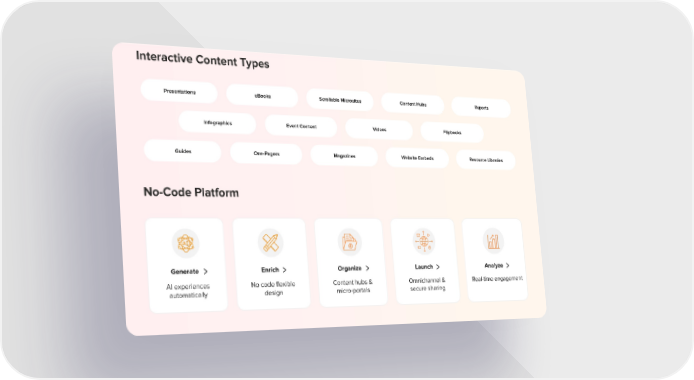 Interactive Content Types Presentations eBooks Scrollable Microsites Content Hubs Reports Infographics Event Content Videos Flipbooks Guides One-Pagers Magazines Website Embeds Resource Libraries No-Code Platform Generate Enrich Organize Launch Analyze AI experiences No code flexible Content hubs & Omnichannel & Real-time engagement automatically design micro-portals secure sharing