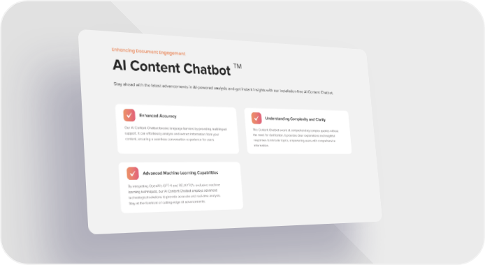 Enhancing Document Engagement TM AI Content Chatbot Stay ahead with the latest advancements in AI-powered analysis and get instant insights with our installation-free AI Content Chatbot. Enhanced Accuracy Understanding Complexity and Clarity Our AI Content Chatbot breaks language barriers by providing multilingual The Content Chatbot excels at comprehending complex queries without support. It can effortlessly analyze and extract information from your the need for clarification. It provides clear explanations and insightful content, ensuring a seamless conversation experience for users. responses to intricate topics, empowering users with comprehensive information. Advanced Machine Learning Capabilities By integrating OpenAI's GPT-4 and RELAYTO's exclusive machine learning techniques, our AI Content Chatbot employs advanced technological solutions to provide accurate and real-time analysis. Stay at the forefront of cutting-edge AI advancements.