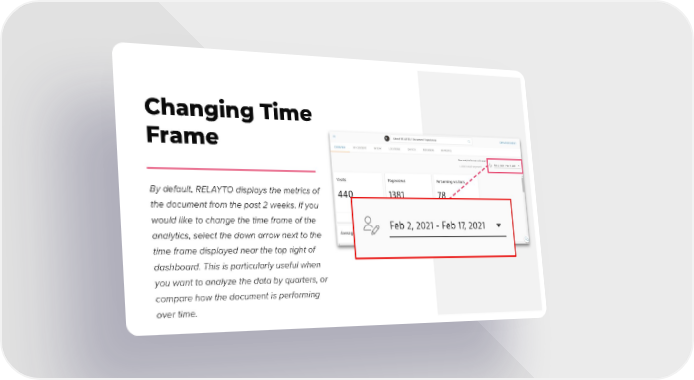 Changing Time Frame By default, RELAYTO displays the metrics of the document from the past 2 weeks. If you would like to change the time frame of the analytics, select the down arrow next to the time frame displayed near the top right of dashboard. This is particularly useful when you want to analyze the data by quarters, or compare how the document is performing over time.