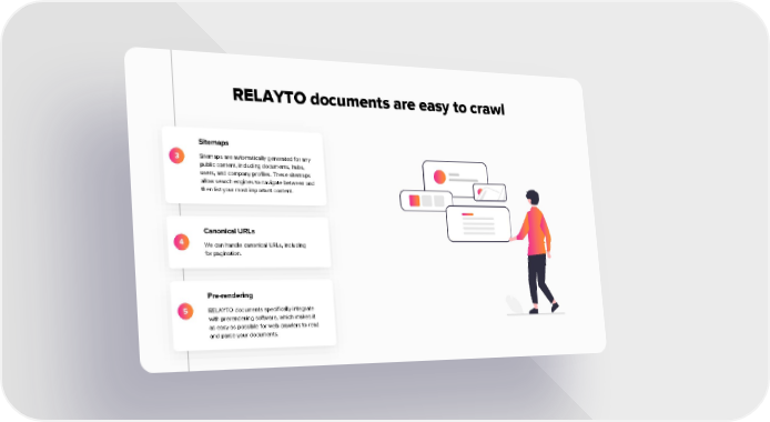 RELAYTO documents are easy to crawl Sitemaps 3 Sitemaps are automatically generated for any public content, including documents, hubs, users, and company profiles. These sitemaps allow search engines to navigate between and then list your most important content. Canonical URLs 4 We can handle canonical URLs, including for pagination. Pre-rendering 5 RELAYTO documents specifically integrate with prerendering software, which makes it as easy as possible for web crawlers to read and parse your documents.