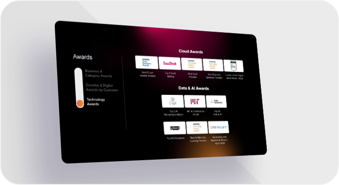 Cloud Awards RELAYTO AI powered platform has brought an entirely new approach to pursuits, by Awards converting all sales content and any file type into a single immersive digital experience, which enables deal teams to connect and collaborate with customers, Best Cloud Top 4 SaaS Best SaaS Best Business Leader in the Digital Business & Vendor Analyst Startup Provider Software Provider Sales Room - 2023 bring big ideas to life and differentiate Accenture from competition. Category Awards Creative & Digital Data & AI Awards Awards by Customer Technology Awards Top 3 AI MIT AI Conference Top 50 Marketing & Adtech AI Idol Data & AI Top 50 Disruptors Best AI/Machine Generative and Learning Provider Applied AI Winner - April 2023