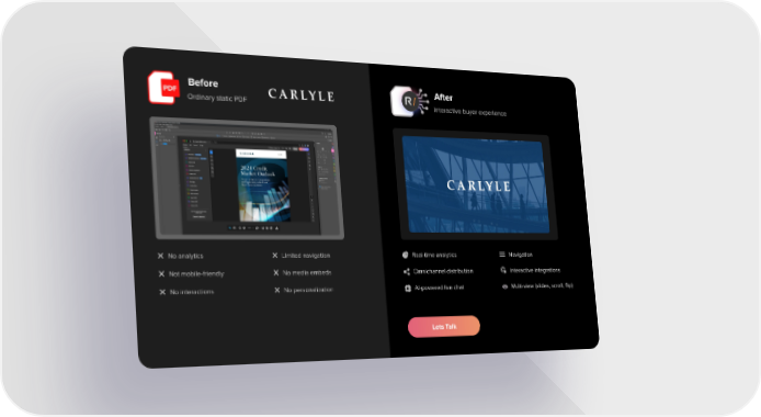 Before After Ordinary static PDF Interactive buyer experience No analytics Limited navigation Real-time analytics Navigation Not mobile-friendly No media embeds Omnichannel distribution Interactive integrations No interactions No personalization AI-powered live chat Multi-view (slides, scroll, flip) Lets Talk