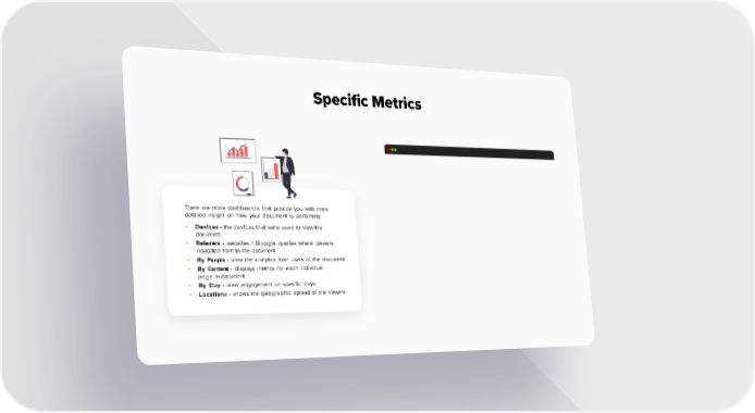 Specific Metrics There are more dashboards that provide you with more detailed insight on how your document is performing: • Devices- the devices that were used to view the document • Referrers - websites / Google queries where viewers navigated from to the document • By People - view the analytics from users of the document • By Content - displays metrics for each individual page in document • By Day - view engagement on specific days • Locations - shows the geographic spread of the viewers
