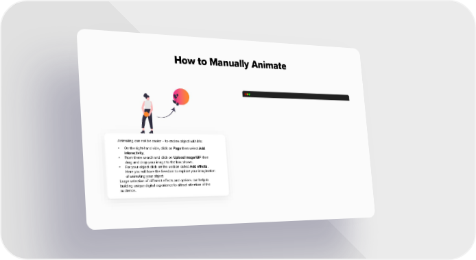 How to Manually Animate Animating can not be easier – to endow object with life: • On the right-hand side, click on Page then select Add interactivity. • From there search and click on Upload image/GIF then drag and drop your image to the box shown. • For your object click on the section called Add effects. Here you will have the freedom to explore your imagination of animating your object Large selection of different effects and options can help in building unique digital experience to attract attention of the audience.