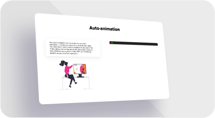 Auto-animation Easy way to enlighten your documents is to add auto- animations. To do this you only need to check the box called “auto-animations” which would be displayed in right panel. This feature allows you to freely animate the whole page, visuals or texts which lets you to get rid of static PDF’s and effortlessly brighten up your document experience.