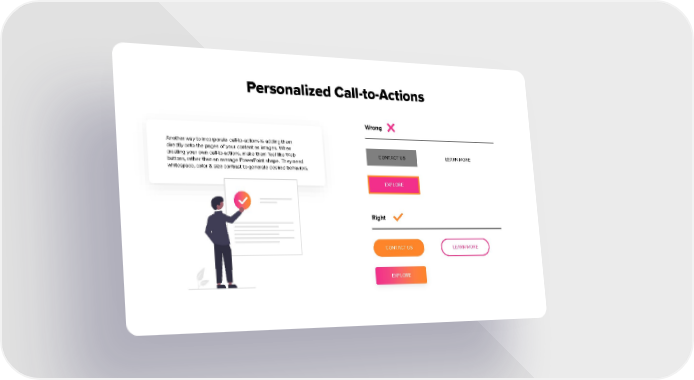 Personalized Call-to-Actions Wrong Another way to incorporate call-to-actions is adding them directly onto the pages of your content as images. When creating your own call-to-actions, make them feel like Web CONTACT US LEARN MORE buttons, rather than an average PowerPoint shape. They need whitespace, color & size contrast to generate desired behaviors. EXPLORE Right CONTACT US LEARN MORE EXPLORE
