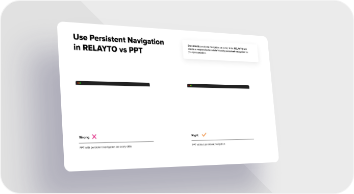 Use Persistent Navigation Do not add persistent navigation on every slide. RELAYTO will create a responsive & mobile friendly persistent navigation for your presentation. in RELAYTO vs PPT Wrong Right PPT with persistent navigation on every slide PPT without persistent navigation