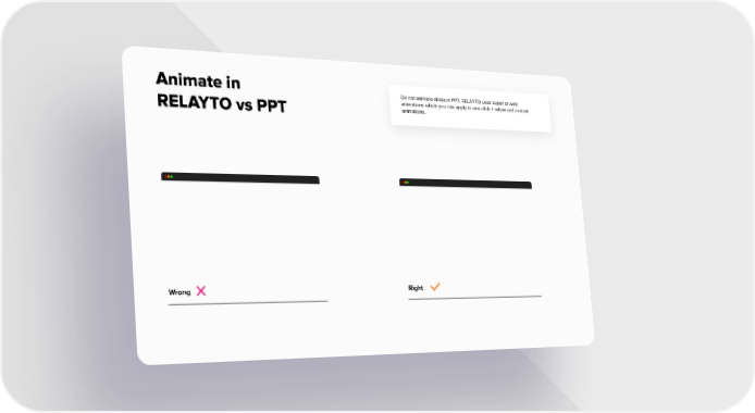 Animate in Do not animate slides in PPT. RELAYTO uses superior web animations which you can apply in one click + advanced custom animations. RELAYTO vs PPT Wrong Right