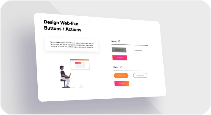Design Web-like Buttons / Actions Wrong When creating hyperlinks and call-to-actions, make them feel like Web buttons, not like an average PowerPoint shape. They need whitespace, color & size contrast to generate desired behaviors. CONTACT US LEARN MORE EXPLORE Right CONTACT US LEARN MORE EXPLORE
