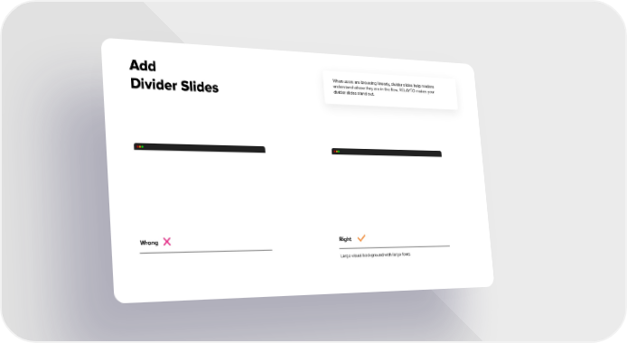 Add When users are browsing linearly, divider slides help readers understand where they are in the flow. RELAYTO makes your divider slides stand out. Divider Slides Wrong Right Large visual background with large fonts