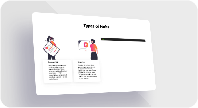 Types of Hubs Document Hub Video Hub Easily arrange & share your Creating video hubs allows documents with a single, you to display your videos in branded location. These a branded environment, hubs can contain all kinds of similar to a YouTube channel documents ー PDF playlists. Providing a “home” presentations, summaries & for your videos with hubs will long-form content ー in one lead to easy access & sharing central place. of your content.