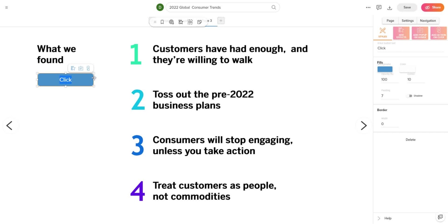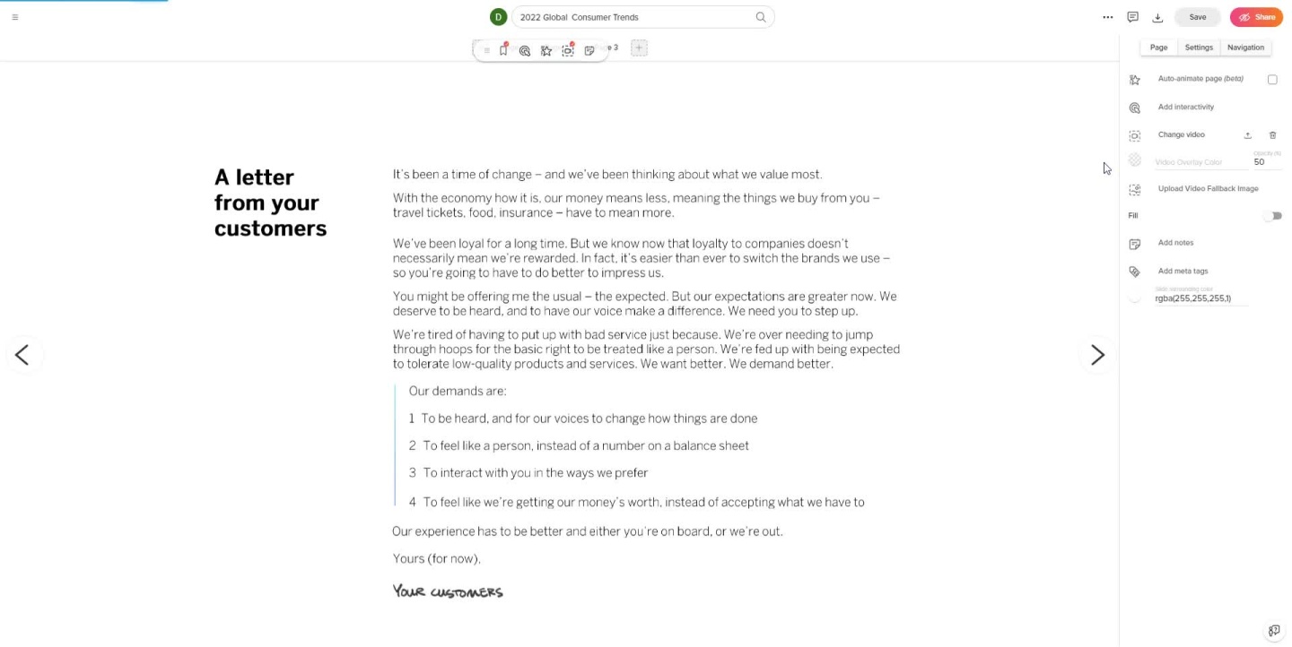 Background Videos Adding background videos to a page in your document will make the viewing experience more interesting because it provides movement to the previously static content. This feature is especially useful for the first page of your document ーit will make a powerful first impression, drawing in the viewer to continue looking at your content.