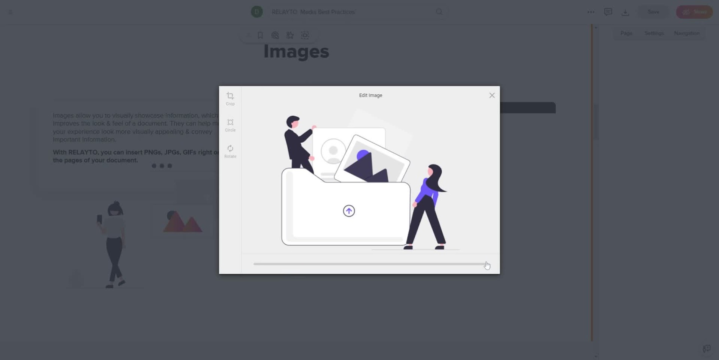 Images Images allow you to visually showcase information, which improves the look & feel of a document. They can help make your experience look more visually appealing & convey important information. With RELAYTO, you can insert PNGs, JPGs, GIFs right onto the pages of your document.