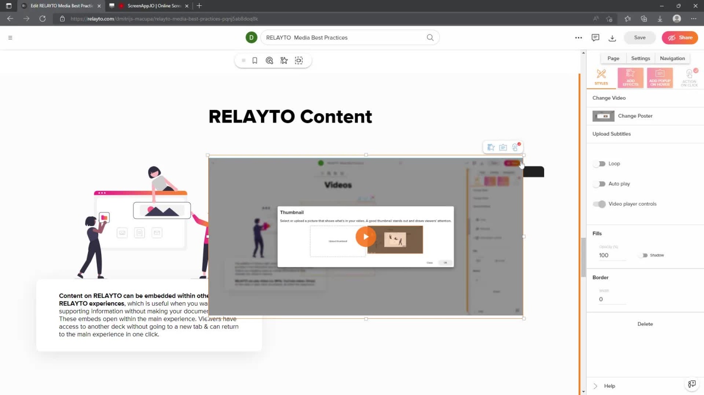 Videos The addition of videos right onto the pages of your document provides a non-disruptive way to turn your content into a story. Videos are engaging ways to convey information & help maintain the viewer’s interest. RELAYTO can play videos (i.e.MP4s, YouTube videos, Vimeo) on the slide or open them as embeds, all within the experience.