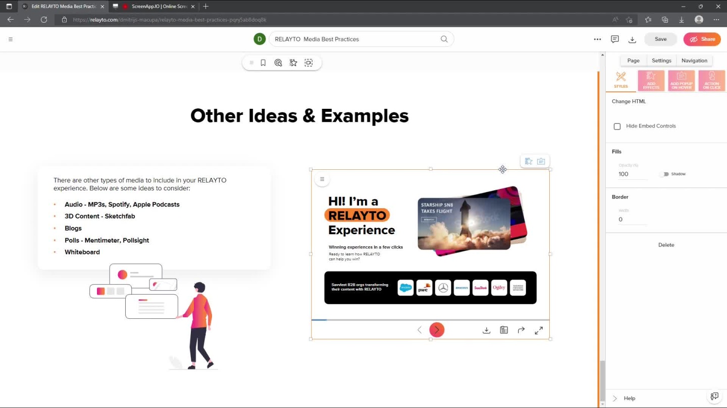 RELAYTO Content Content on RELAYTO can be embedded within other RELAYTO experiences, which is useful when you want to add supporting information without making your document denser. These embeds open within the main experience. Viewers have access to another deck without going to a new tab & can return to the main experience in one click.