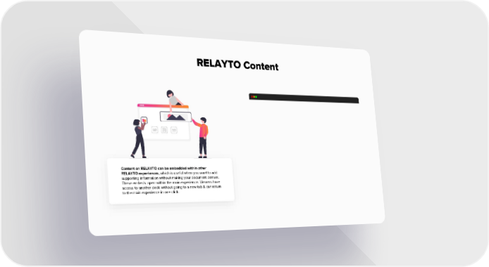 RELAYTO Content Content on RELAYTO can be embedded within other RELAYTO experiences, which is useful when you want to add supporting information without making your document denser. These embeds open within the main experience. Viewers have access to another deck without going to a new tab & can return to the main experience in one click.