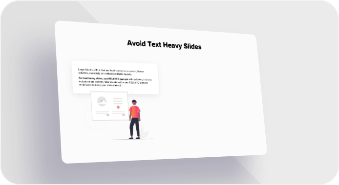 Avoid Text Heavy Slides Large blocks of text that are hard to read on a screen. Dense columns, especially on vertical/scrollable layouts. For text heavy slides, use RELAYTO popups with pulsating icons to indicate more content. Use visuals with more RELAYTO content embedded to keep your slide minimal.