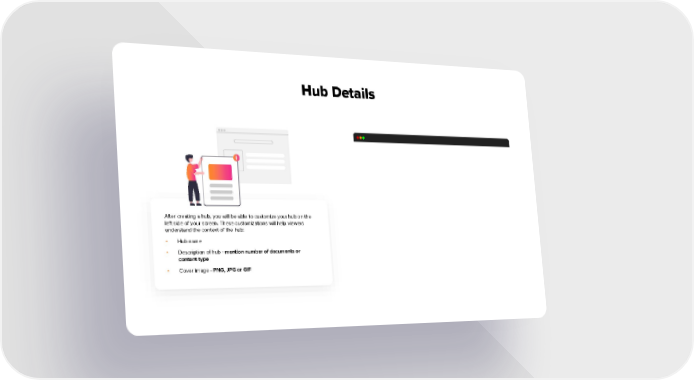 Hub Details After creating a hub, you will be able to customize your hub on the left side of your screen. These customizations will help viewers understand the context of the hub: • Hub name • Description of hub - mention number of documents or content type • Cover image - PNG, JPG or GIF