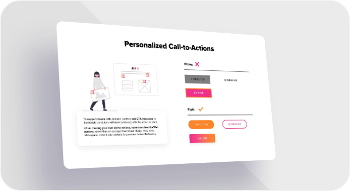 Personalized Call-to-Actions Wrong CONTACT US LEARN MORE EXPLORE Right To support visuals with clickable content, add CTA Indicators to thumbnails so visitors will know to interact with the action on click. When creating your own call-to-actions, make them feel like Web CONTACT US LEARN MORE buttons, rather than an average PowerPoint shape. They need whitespace, color & size contrast to generate desired behaviors. EXPLORE