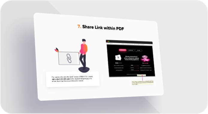 7. Share Link within PDF For readers who view the ‘print’ version of RELAYTO/ content, add a short URL/QR code to the original PDF/print pages to inform them that there is an interactive version.