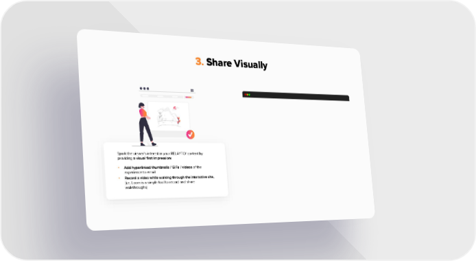 3. Share Visually Spark the viewer’s interest in your RELAYTO/ content by providing a visual first impression: • Add hyperlinked thumbnails / GIFs / videos of the experience to email • Record a video while walking through the interactive site, (i.e. Loom is a simple tool to record and share walkthroughs)