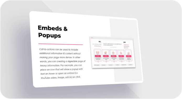 Embeds & Popups Call-to-actions can be used to include additional information & content without making your page more dense. In other words, you can creating a digestible page of heavy information. For example, you can place an icon that will show a popup with text on hover or open an embed (i.e YouTube video, image, article) on click.