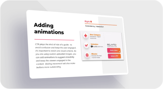 Right Consistency, interaction Adding animations CTA plays the kind of role of a guide - to avoid confusion and keep the user engaged, it’s important to retain one visual scheme. As you are using custom uploaded images, you can add animations to suggest clickability and keep the viewers engaged in the content. Adding movement will also make buttons more outstanding.