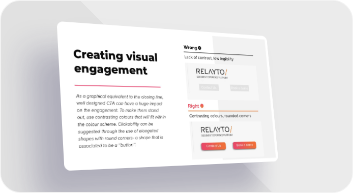 Wrong Lack of contrast, low legibility Creating visual engagement As a graphical equivalent to the closing line, well designed CTA can have a huge impact Right on the engagement. To make them stand Contrasting colours, rounded corners out, use contrasting colours that will fit within the colour scheme. Clickability can be suggested through the use of elongated shapes with round corners- a shape that is associated to be a ‘’button’’.