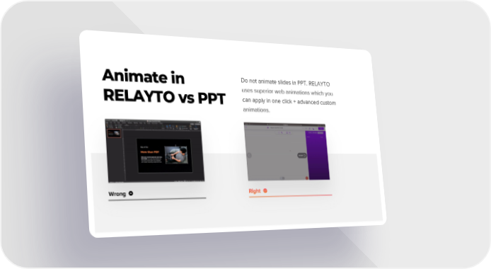 Animate in Do not animate slides in PPT. RELAYTO uses superior web animations which you RELAYTO vs PPT can apply in one click + advanced custom animations. Wrong