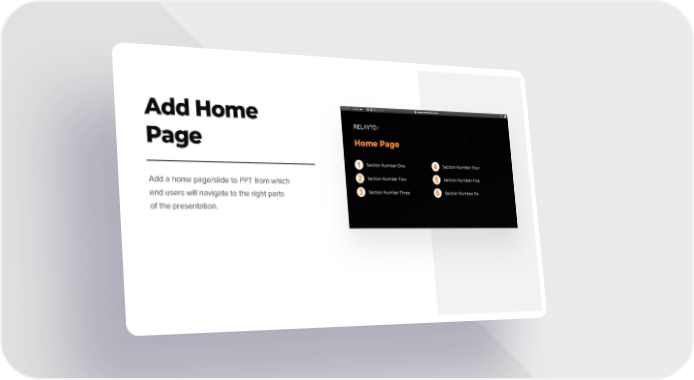 Add Home Page Add a home page/slide to PPT from which end users will navigate to the right parts of the presentation.
