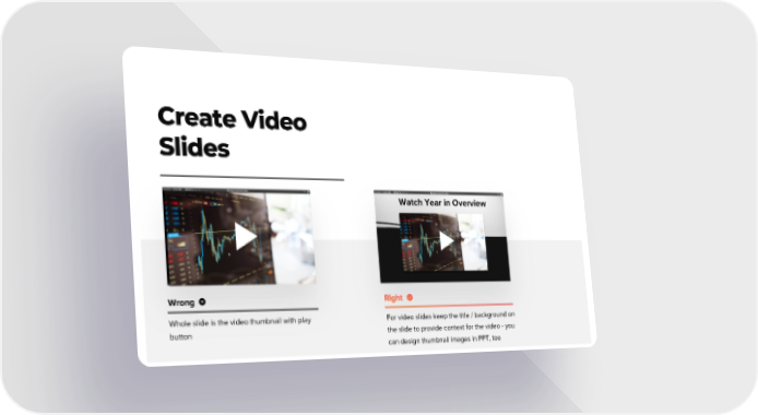 Create Video Slides Watch Year in Overview Wrong Whole slide is the video thumbnail with play For video slides keep the title / background on button the slide to provide context for the video - you can design thumbnail images in PPT, too