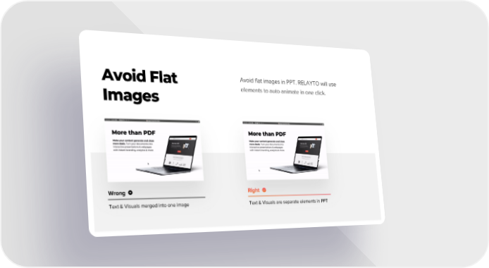 Avoid Flat Avoid flat images in PPT. RELAYTO will use Images elements to auto-animate in one click. Wrong Text & Visuals merged into one image Text & Visuals are separate elements in PPT