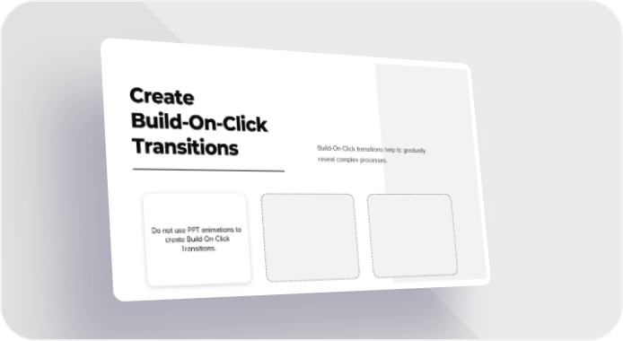 Create Build-On-Click Transitions Build-On-Click transitions help to gradually reveal complex processes. Do not use PPT animations to create Build-On-Click Transitions.