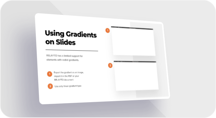 Using Gradients 1 on Slides RELAYTO has a limited support for elements with radial gradients. 2 1 Export the gradient as an image, import it in the PDF or your RELAYTO document 2 Use only linear gradient type