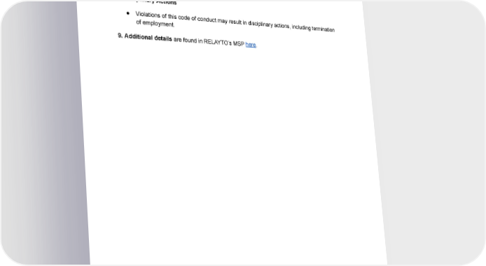 7. Reporting Violations ● Employeesareencouragedtoreportanyviolations of this code of conduct to their managerorHRdepartment. ● Reportswill be handled confidentially and without retaliation. 8. Disciplinary Actions ● Violations of this code of conduct may result in disciplinary actions, including termination of employment. 9. Additional details are found in RELAYTO’s MSP here.