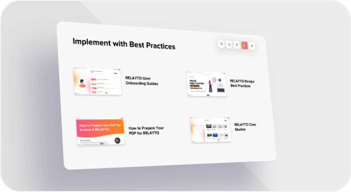 RELAYTO Enterprise Engagement Model Page 5 Page 7Implement with Best Practices R A P I D RELAYTO User RELAYTO Design Onboarding Guides Best Practices How to Prepare Your RELAYTO Case PDF for RELAYTO Studies