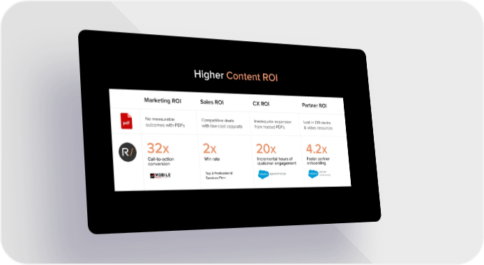 Higher Content ROI Marketing ROI Sales ROI CX ROI Partner ROI No measurable Competitive deals Inadequate expansion Lost in 139 decks outcomes with PDFs with low-cost copycats from hosted PDFs & video resources 32x 2x 20x 4.2x Call-to-action Win rate Incremental hours of Faster partner conversion customer engagement onboarding Top 3 Professional Services Firm