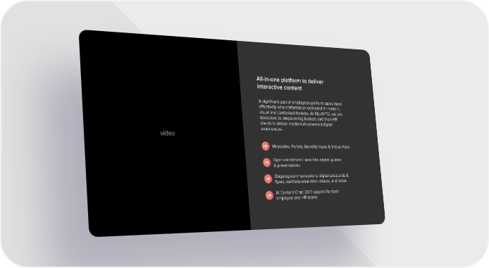 All-in-one platform to deliver interactive content A significant part of employees perform tasks more effectively when information delivered in modern, visual and contextual formats. At RELAYTO, we are dedicated to empowering brokers and their HR clients to deliver modern AI-powered digital experiences: Microsites, Portals, Benefits Hubs & Virtual Fairs Open enrollment / new hire digital guides & presentations Ongoing communications: digital postcards & flyers, wellness education videos, and more AI Content Chat: 24/7 support for both employee and HR teams video